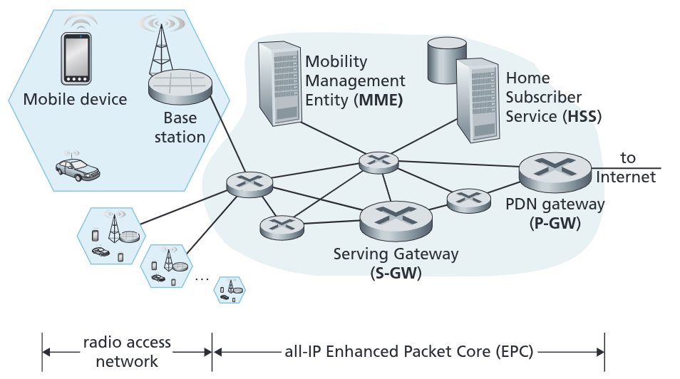 P-GW: connette la rete ad internetS-GW: sono dei gateway che permettono l’instradamento dei dati.HSS: matiene i record di tutti gli utenti iscrittiMME: mantiene informazioni relative alle celle nei quali si trova un dispositivo in un certo momento. Fonrisce i sistemi di autenticazione, di path setup e di cell location tracking..