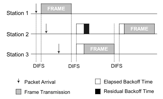 Se invece trovasse il canale occupato, procede ad aspettare un tempo casuale aggiuntivo, detto di backoff, dopo che rileva il canale idle dopo DIFS.