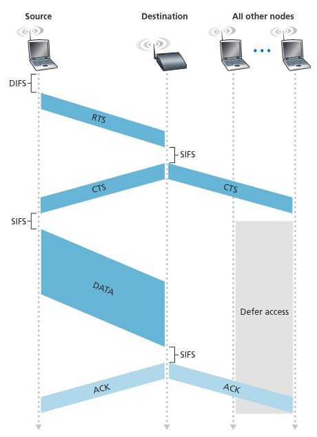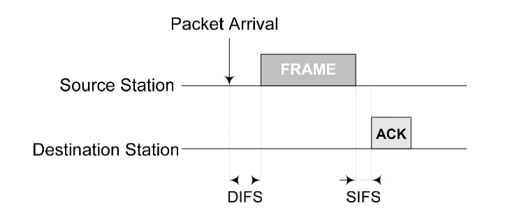 Il ricevitore invece, quando riceve un frame corretto restituisce un messaggio di ACK dopo un intervallo SIFS minore di DIFS.