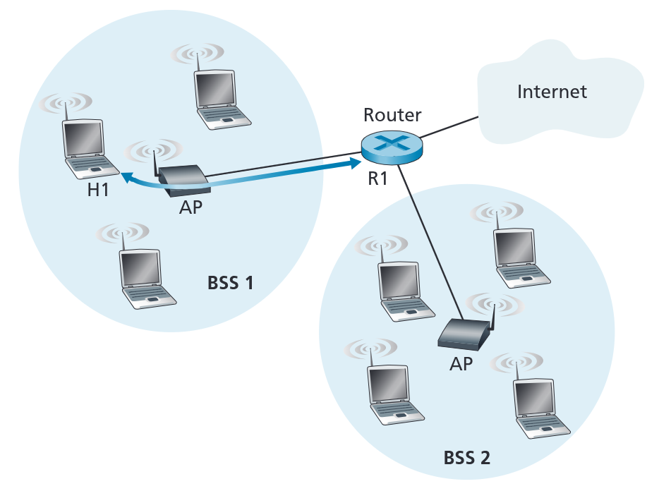 Quando il router dovrà inoltrare un messaggio verso la stazione wireless $H_1$, lui non sarà a conoscenza del fatto che è presente un AP tra lui e l’host, ma crede che $H_1$ sia banalmente un host della sottorete alla quale lui fa parte.