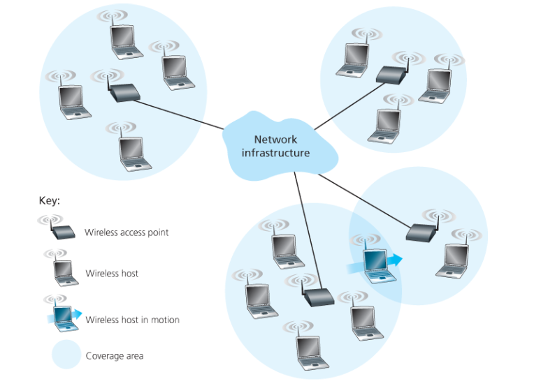 Identificando l’infrastruttura di rete come la rete sulla quale un host wireless potrebbe voler comunicare, vediamo adesso come i vari “pezzi” di una rete wireless possono essere assemblati per ottenere diversi tipi di reti wireless.