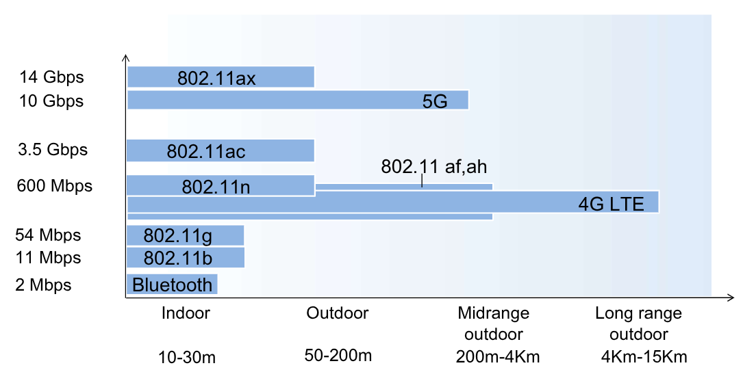 La tecnologia con range e bit-rate più basso è la Bluetooth (802.15 stadard per reti short-range-low-power, la versione 802.15.1 indica la versione high-bit-rate ovvero 1Mbps), che è stata pensata per connettere diversi dispositivi sulle scrivanie.