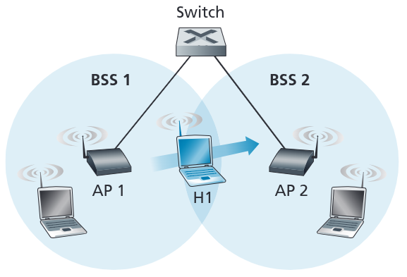 L’immagine sulla destra mostra due BSS interconnessi, ed un host $H_1$ che si sposta da BSS1 a BSS2.