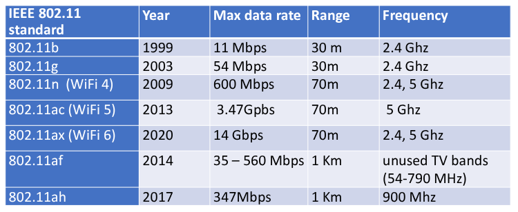 Hanno area di copertura locale ($\approx 100m$) e permettono trasmissioni con bit-rate che variano a seconda delle vare versioni (dagli 11Mbps fino alla velocità nominale di 14Gbps).