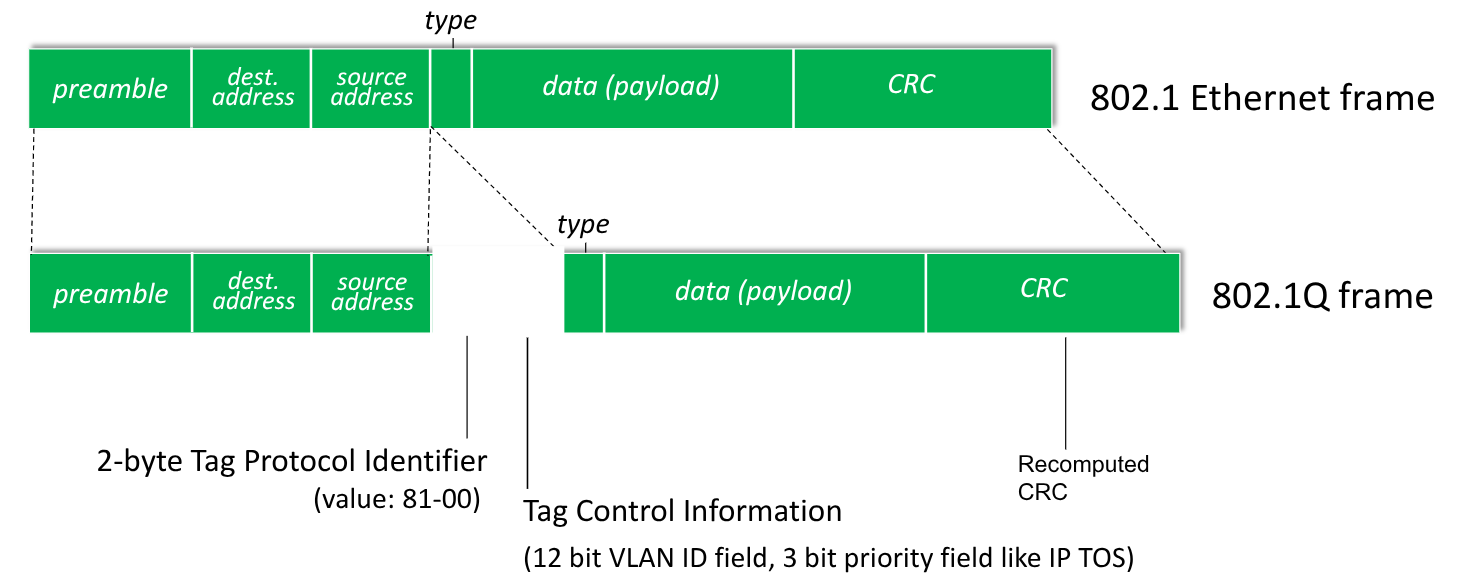 Al formato ethernet standard sono aggiunti 2Byre per l’identificatore di protocollo, 12bit che identificano l’ID della VLAN e 3 che ne sanciscono la priorità (come nelle tabelle a livello IP).