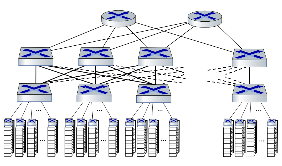 Gli switch di livello 2 sono a loro volta connessi a uno o più switch di livello 1 (anch’esso a gruppi di circa 16). I vari switch di livello 1 sono connessi ai vari router di uscita