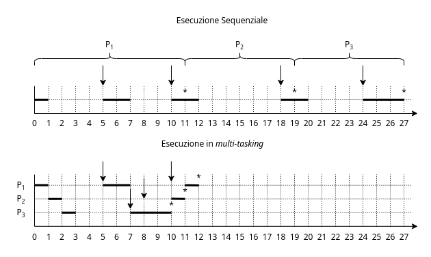 Nell’esecuzione multi-tasking invece, quando il primo processo va in IO-burst, e si mette in attesa, la CPU inizia a lavorare prima sul secondo processo, e poi sul terzo quando anche il secondo va in attesa. Durante i momenti nei quali i vari programmi sono sospesi, questi vengono poi recuperati nell’ordine in cui ricevono i dati che attendono, e verranno messi in esecuzione quando colui che occupa l’esecuzione terminerà e/o andrà nuovamente in attesa. Possiamo quindi calcolare anche in questo caso l’efficienza, che stavolta è di $\frac{10}{12} \approx 83\%$