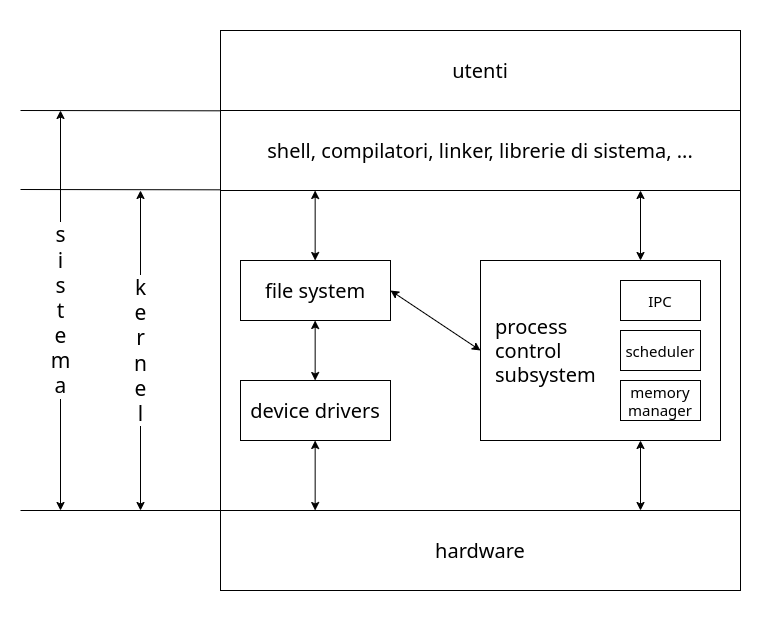 Nei sistemi UNIX in particolare fanno parte del sistema sia le tipiche componenti di un OS invocate tramite le chiamate di sistema, eseguite in uno stato privilegiato e identificate globalmente con il termine di kernel, sia l’insieme dei programmi di utilità del sistema (shell, compilatori, caricatori, linker, librerie, …) eseguiti in uno stato non privilegiato come normali programmi.