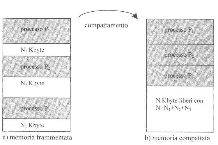 Questa tecnica permette di rilocare i segmenti frammentati effettuando degli swap-out dei processi frammentati e successivamente degli swap-in per ricaricarli su indirizzi contigui, così da non avere più i “buchi” tra i segmenti dei diversi processi.