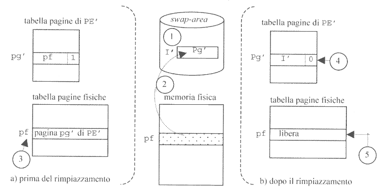 Solamente quanto torna in esecuzione si aggiornerà la tabella delle pagine di processo, settando P = 1 e aggiornando il contenuto del campo indirizzo della pagina con l’indirizzo del frame.