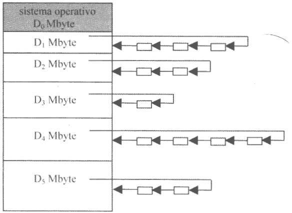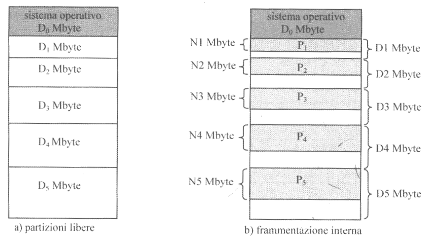 Sulla destra possiamo vedere un esempio di memoria divisa in $6$ partizioni, dove la prima, con indirizzo virtuale $0$ e dimensioni $D_0$, è quella riservata al sistema operativo.