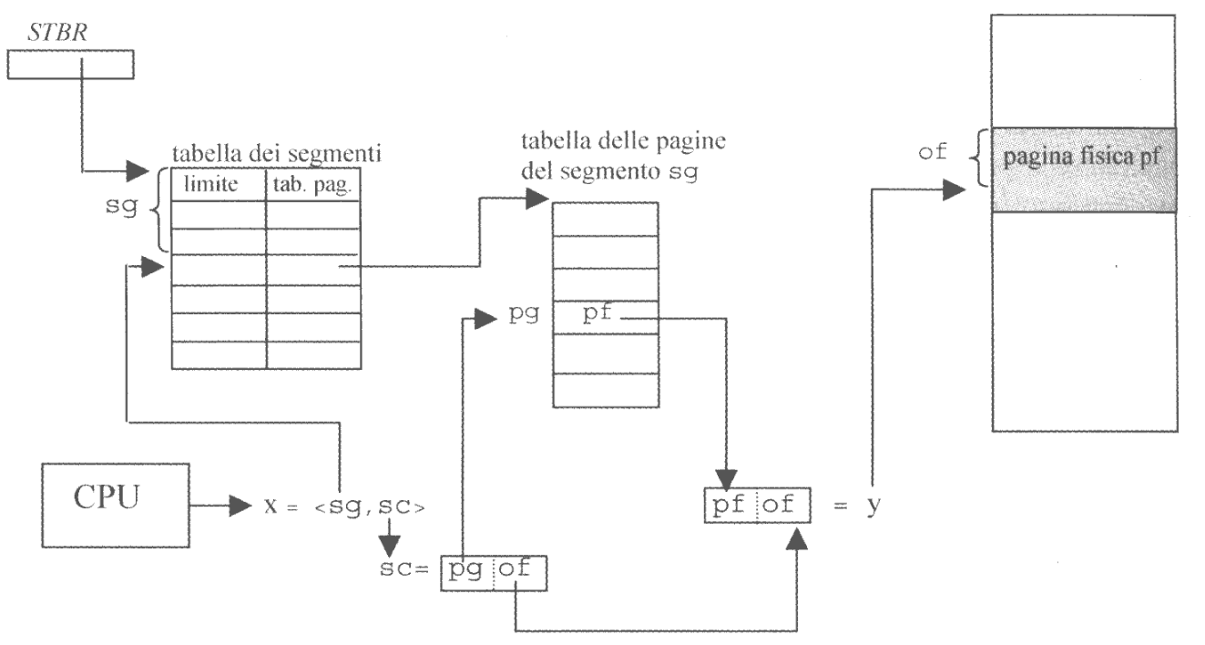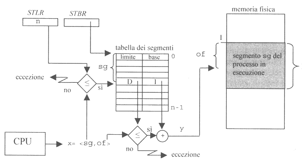 STLR (Segment Table Limit Register): contiene il numero di segmenti del processiSTBR (Segment Table Base Register): contiene l’indirizzo fisico della tabella dei segmentiNell’immagine sulla desta possiamo vedere come viene tradotto un indirizzo virtuale x generato dalla CPU.