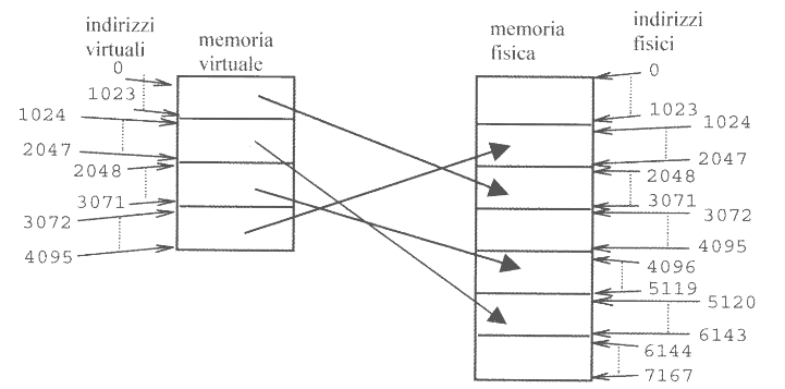 Nell’esempio a destra possiamo vedere una suddivisione in pagine di 1K su una memoria virtuale di 4K, ovvero di quattro pagine.