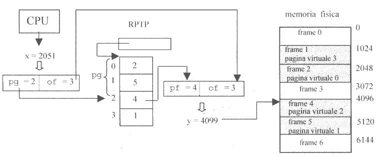 Lo scostamento è a sua volta composto da sc = <pg, of>. L’indice pg viene utilizzato come indice nella tabella delle pagine (sempre previ controlli di protezione), per ottenere l’indirizzo del frame pf e andare a costruire l’indirizzo fisico y = <pf, of>