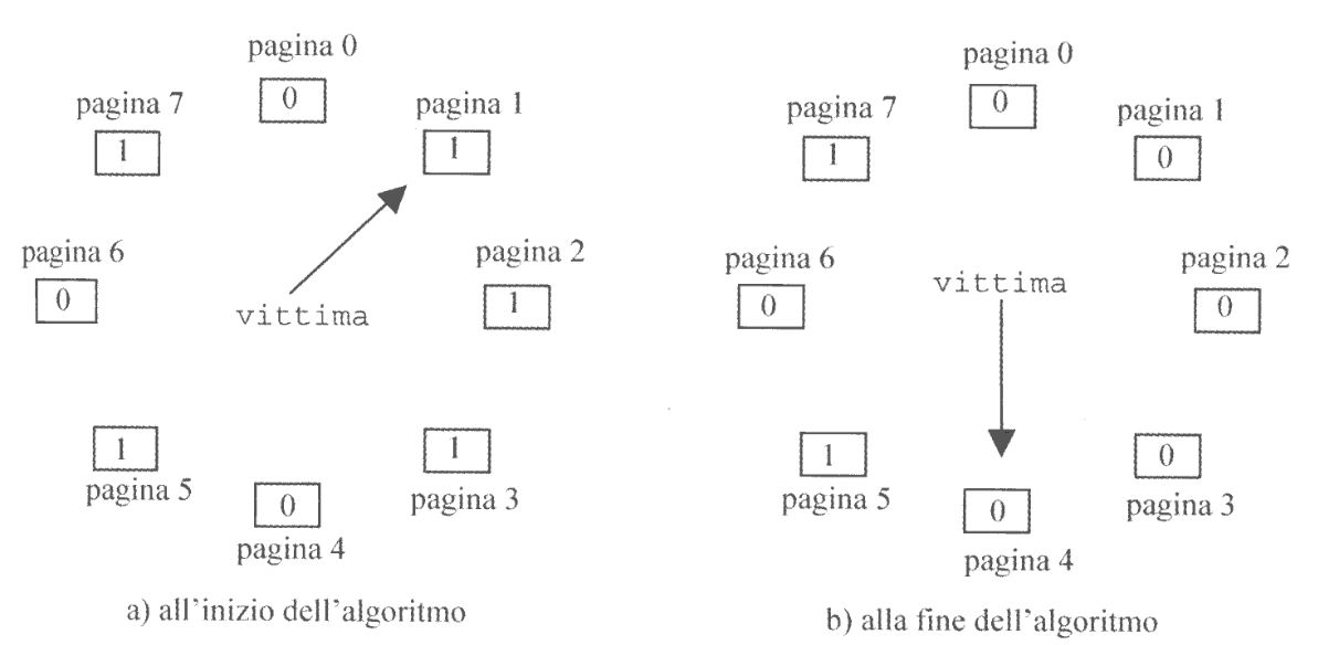 U == 0: la pagina viene scelta per il rimpiazzamentoU == 1: si azzera il bit e si incrementa la variabile vittima, andando ad esaminare la pagina successiva, riverificando il bit U.Poiché l’incremento della variabile è modulato al numero delle pagine fisiche M (vittima = (vittima + 1) % M) abbiamo la garanzia che troveremo certamente un pagina con U == 0.