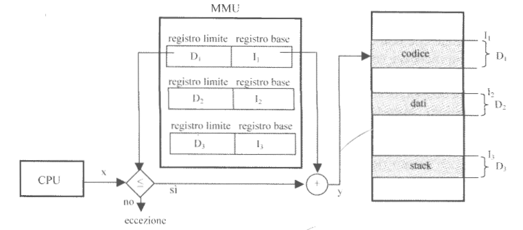 La CPU genera un indirizzo virtuale x composto dalle due componenti <sg, sc> (<segmento, scostamento>).