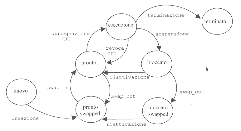 Le transizioni tra gli stati pronto o bloccato e i corrispondenti stati swapped corrispondo all’esecuzione delle primitive swap_in e swap_out.