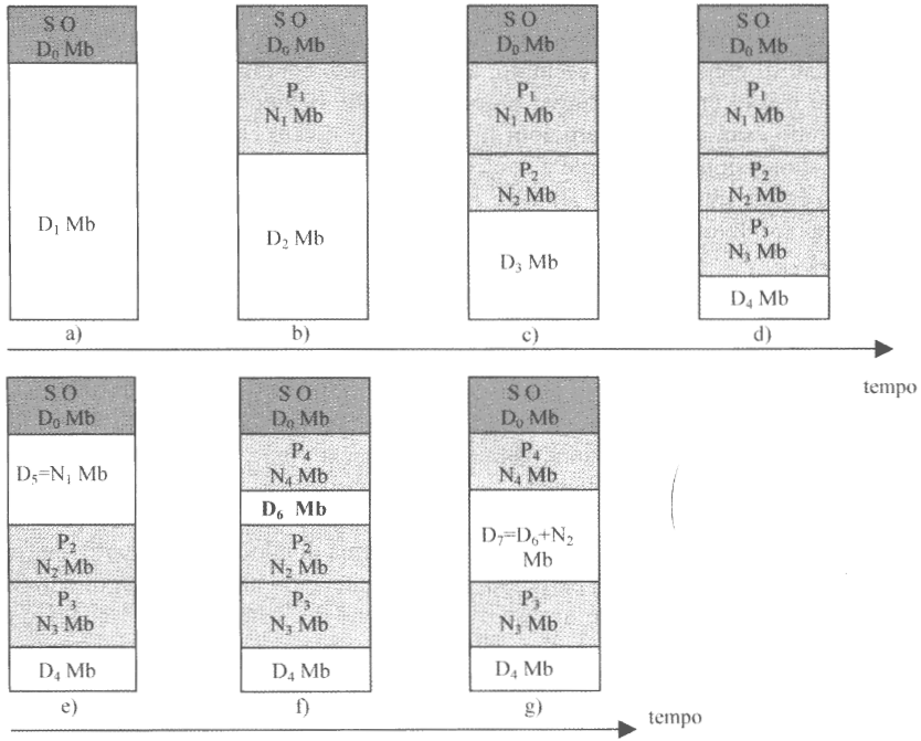 Nell’istante f viene allocato $P_4$ con dimensioni più piccole di $P_1$, andando a generare una nuova partizione $D_6 = D_5 - N_4$.