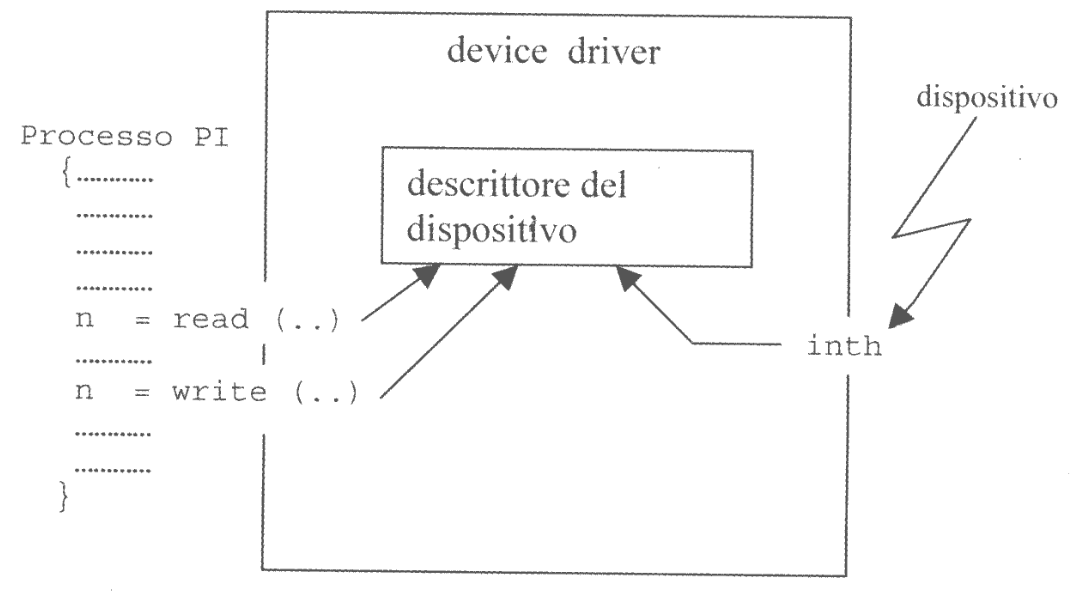 dato_disponibilecontatorepuntatoreesitoPer semplificare quanto è stato già detto, possiamo adesso illustrare come è strutturato il driver di un dispositivo, mostrando le funzioni di lettura o scrittura che appartengono all’interfaccia device independent.