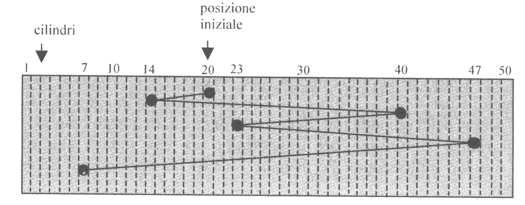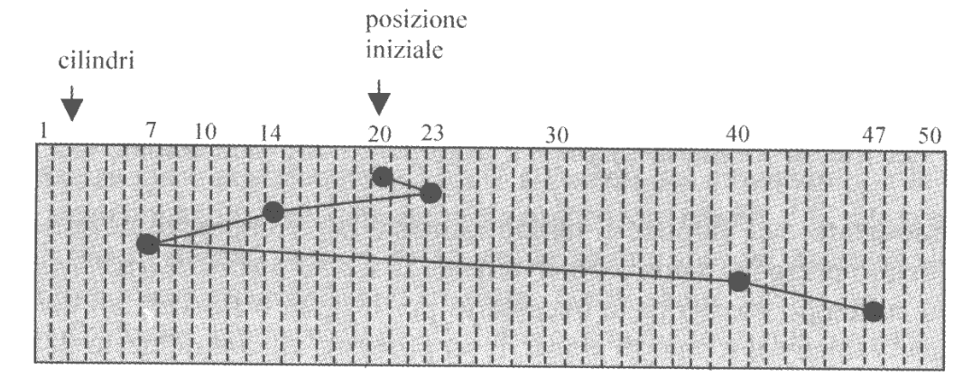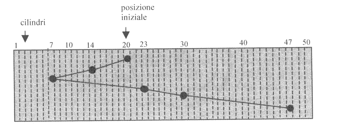 Con riferimento all’immagine precedente (immaginando che la situazione di partenza sia decrescente) le richieste sarebbero servite nell’ordine 20, 14, 7, 23, 40 e 47, per uno spostamento totale di $53$ cilindri.