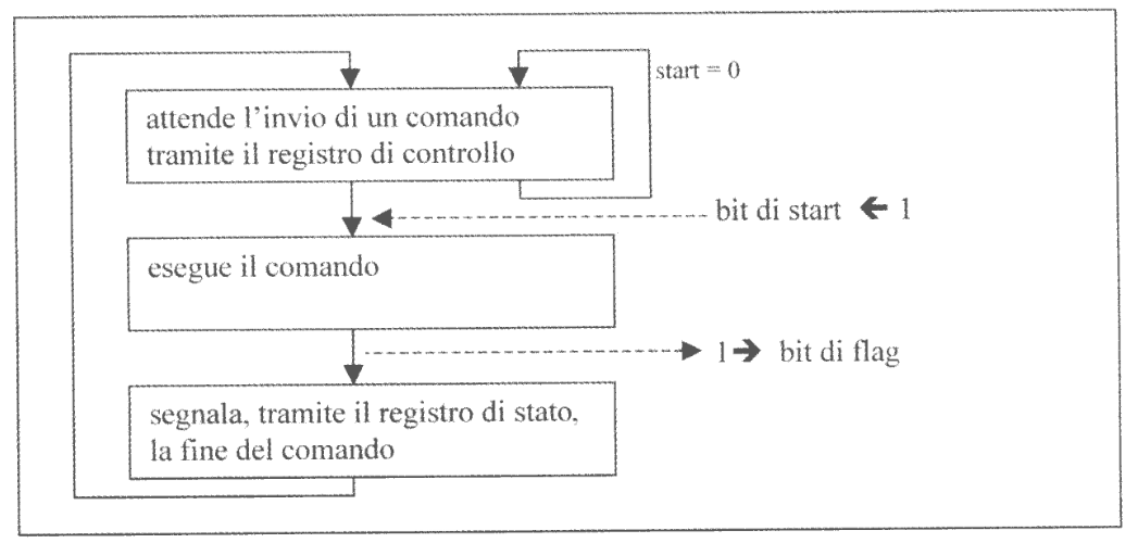 È poi sicuramente presente un bit di abilitazione alle interruzioni che abilita il controllare a inviare segnali di interruzioni alla CPU per segnalare la terminazione dell’operazione del dispositivo.