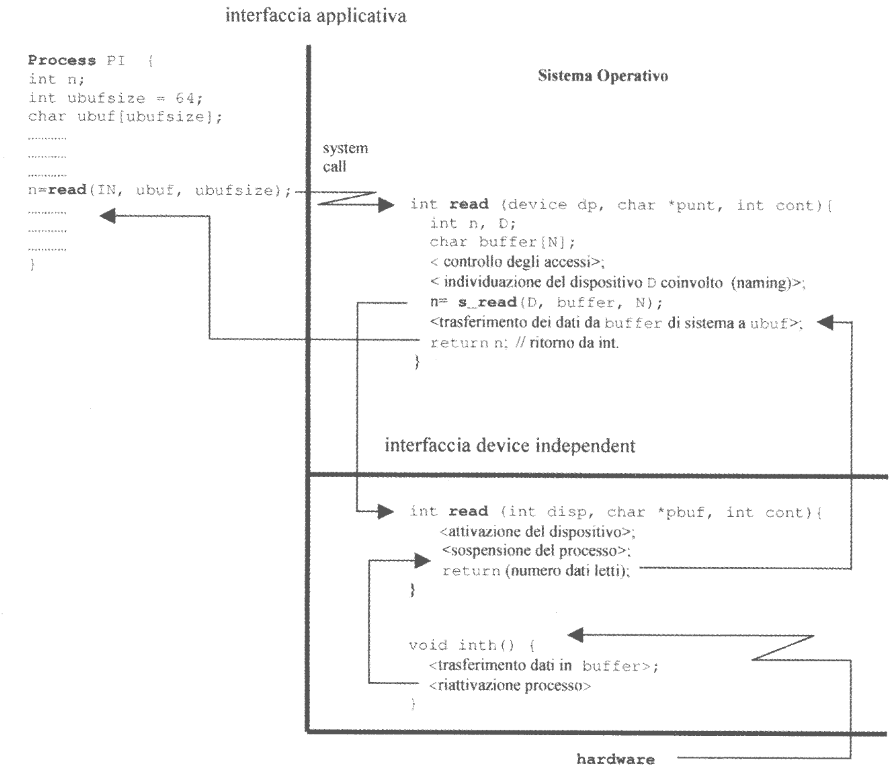 Al fine di chiarire quanto detto finora, illustriamo com’è strutturato il flusso di controllo durante l’esecuzione di una chamata di sistema relativa ad un trasferimento di dati.