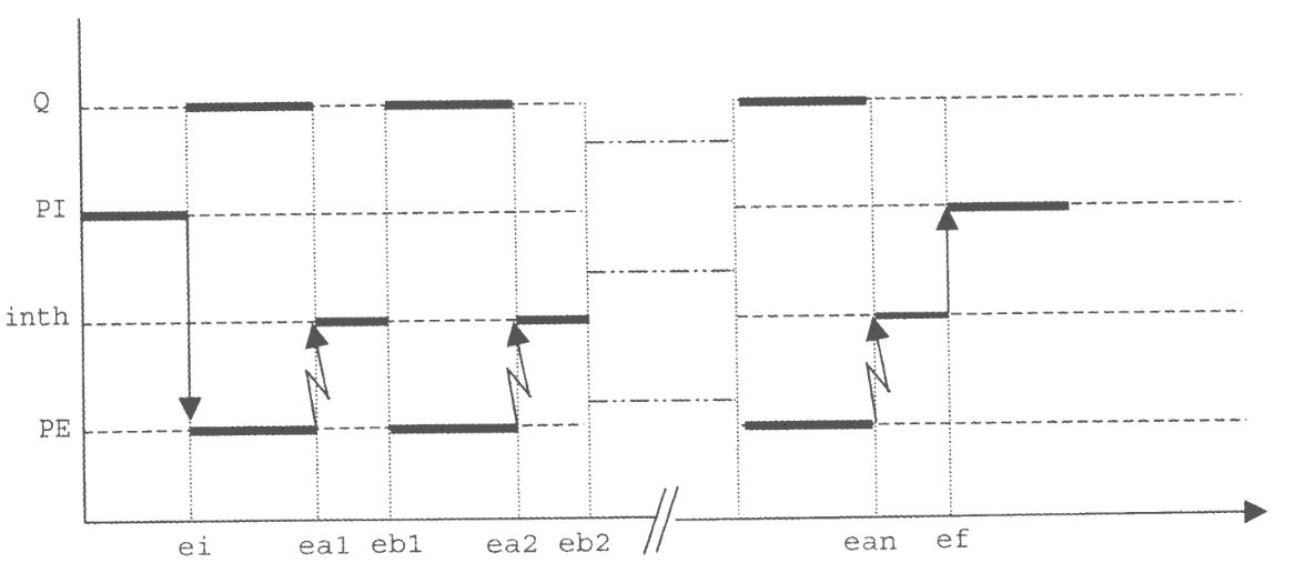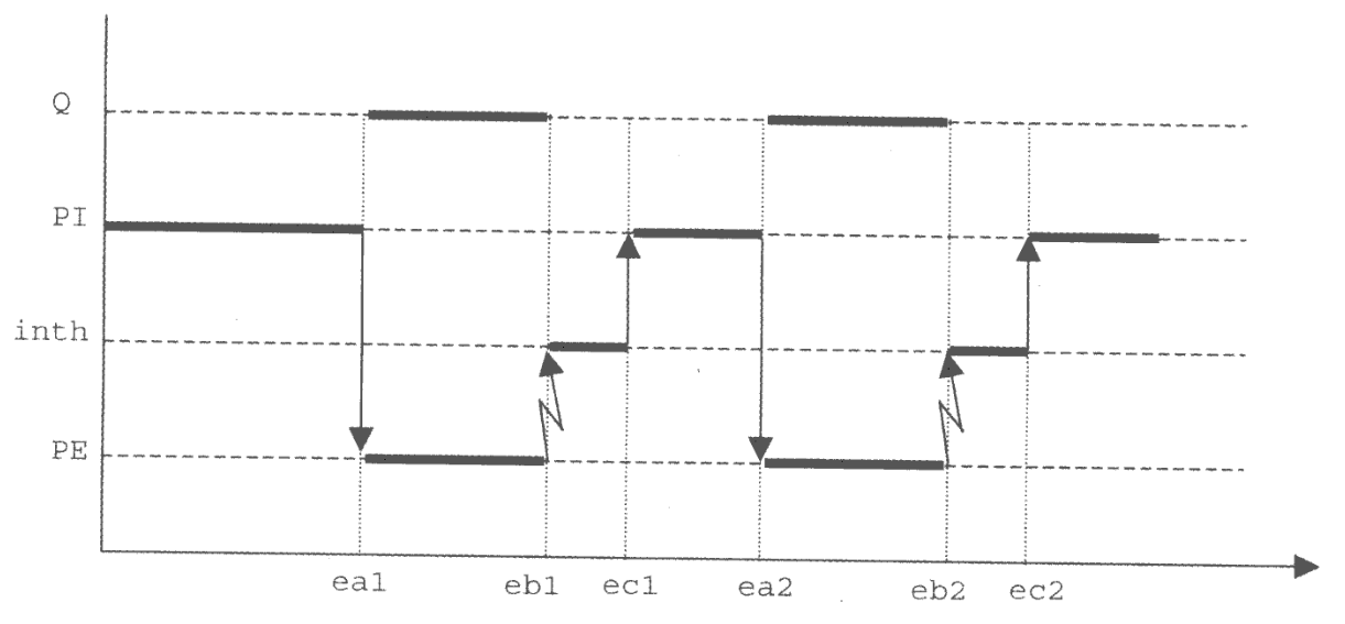 All’istante ea2, PE termina l’attività viene posto a uno il flag, interrompendo la CPU, mandando in esecuzione la routine di interruzione inth che esegue una signal sul semaforo, riattivando PI.