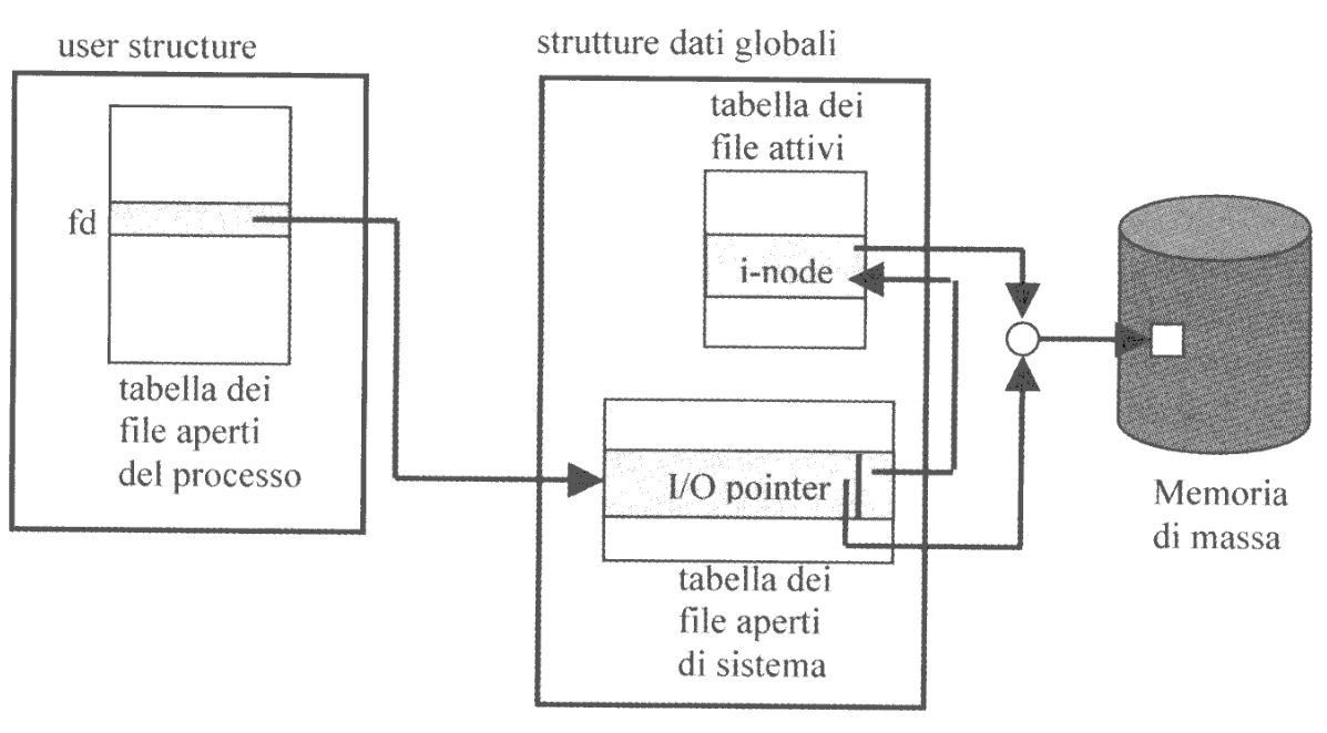 A livello globale il kernel mantiene una Tabella dei File Aperti del Sistema (TFAS) allocata nella user structure del processo. Questa tabella contiene un elemento per ogni file aperto nel sistema, individuato da un indice intero detto file descriptor fd. Questo elemento non è altro che un puntatore all’i-node del file salvato nella Tabella dei File Attivi, copiata dalla memoria di massa.