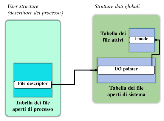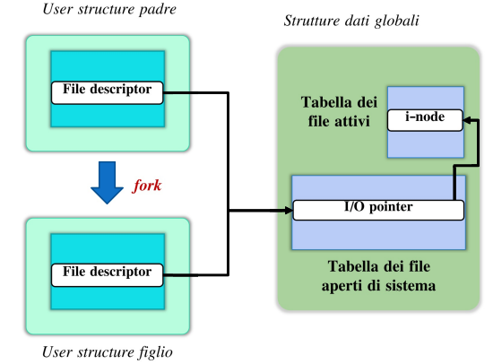 Ciò implica che un processo padre e i suoi processi figli descrittori che puntano allo stesso elemento della Tabella di File di Sistema e quindi condividono l’I/O pointer nell’accesso sequenziale al file.