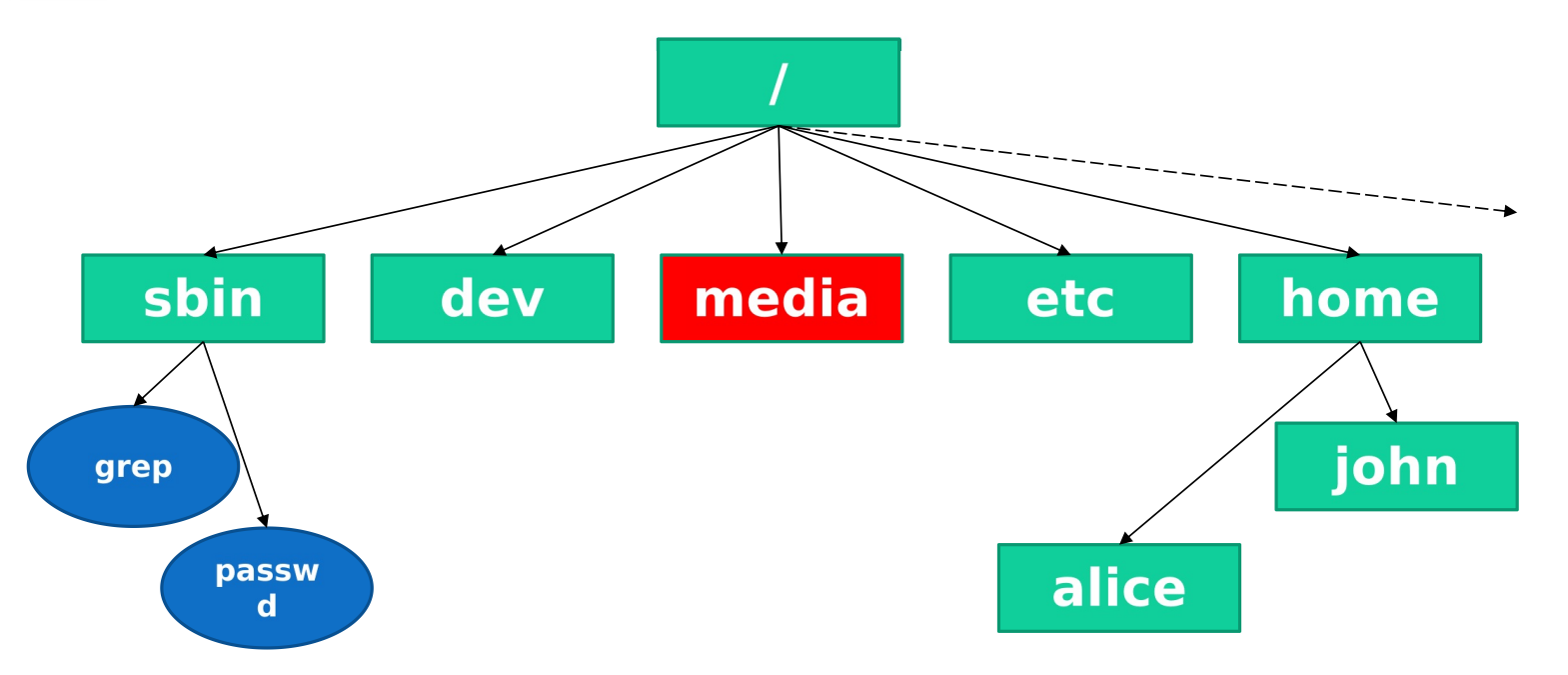 /: è la root del filesystem/home: contiene le home directory degli utenti del sistema/sbin: contiene i programmi del sistema/etc: contiene i file di configurazione/dev: rende accessibili le periferiche/media: rende accessibili i supporti removibiliIl comando per rendere accessibile un filesystem in una determinata posizione del virtual filesystem è mount: